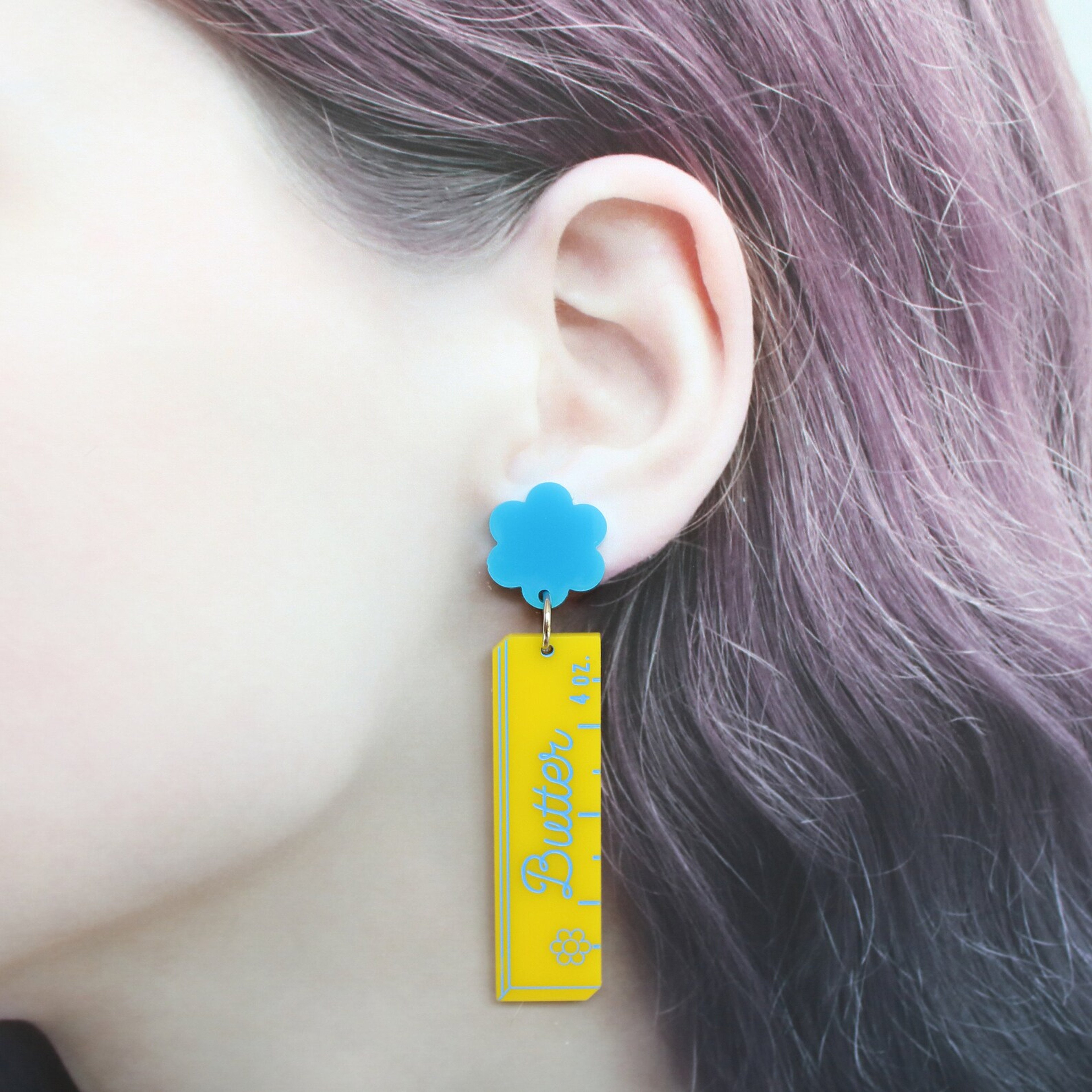 Add a playful twist to your accessory collection with these acrylic butter dangle Earrings! Inspired by a classic stick of- you guessed it, butter. These quirky earrings feature a vibrant yellow acrylic charm, made from lightweight acrylic, and are comfortable for all-day wear and perfect for anyone who loves unique, food-inspired fashion.