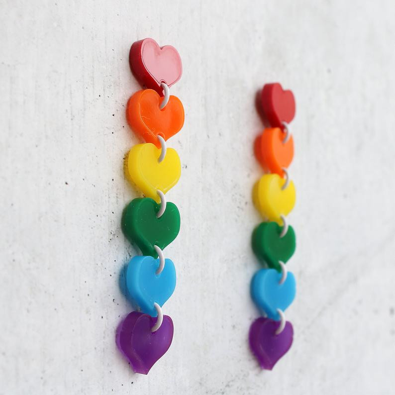Unique and lightweight, Rachel O’s acrylic earrings are the perfect statement piece for your ears. Earrings measure about 2.6 inches long, and have nickel-free hypoallergenic titanium posts. Hearts are about a half inch wide, and are linked together with white jump-rings.