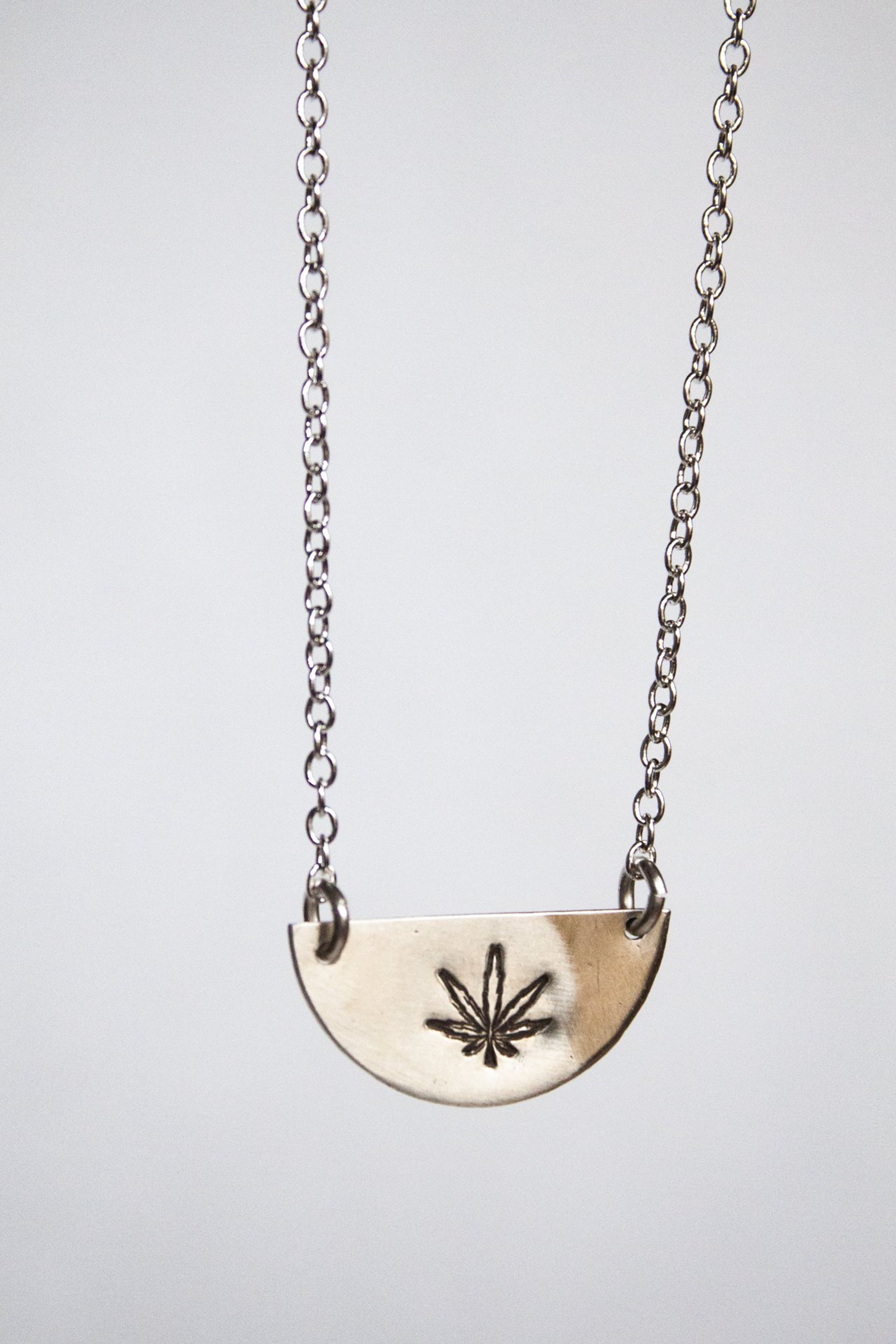 A little silver half-moon with a cannabis leaf set on a 20" silver cable chain.