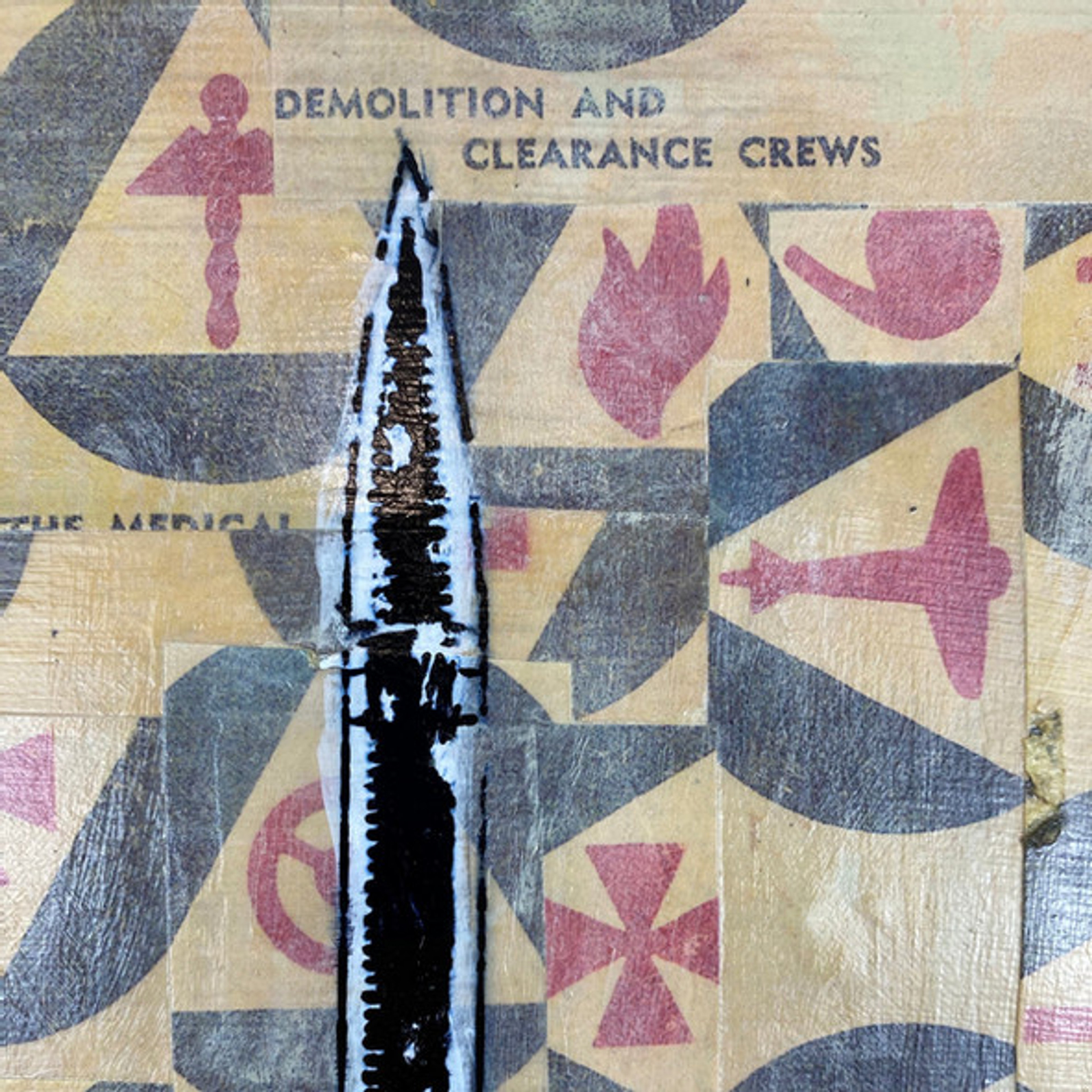 This piece is made up of parts from Citizen Shay's grandfather's vintage Civilian Defense Corps symbol book from WW2, along with vintage illustrations and photos from Life Magazine during WW2. The graphic symbols create a perfect backdrop for the story of the defense missile being launched. But is this defensive, or offensive?