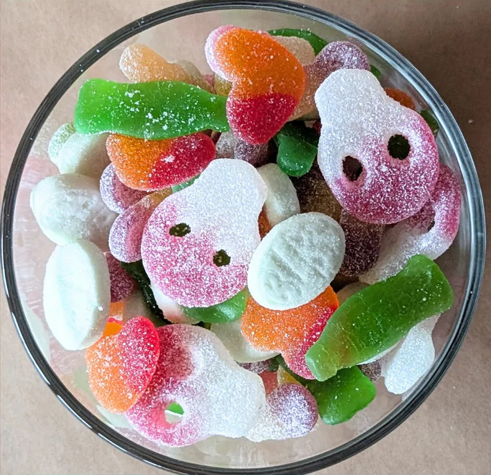 Peach hearts, sour pear Bubs, pear bottles, berry skulls, sour dummies