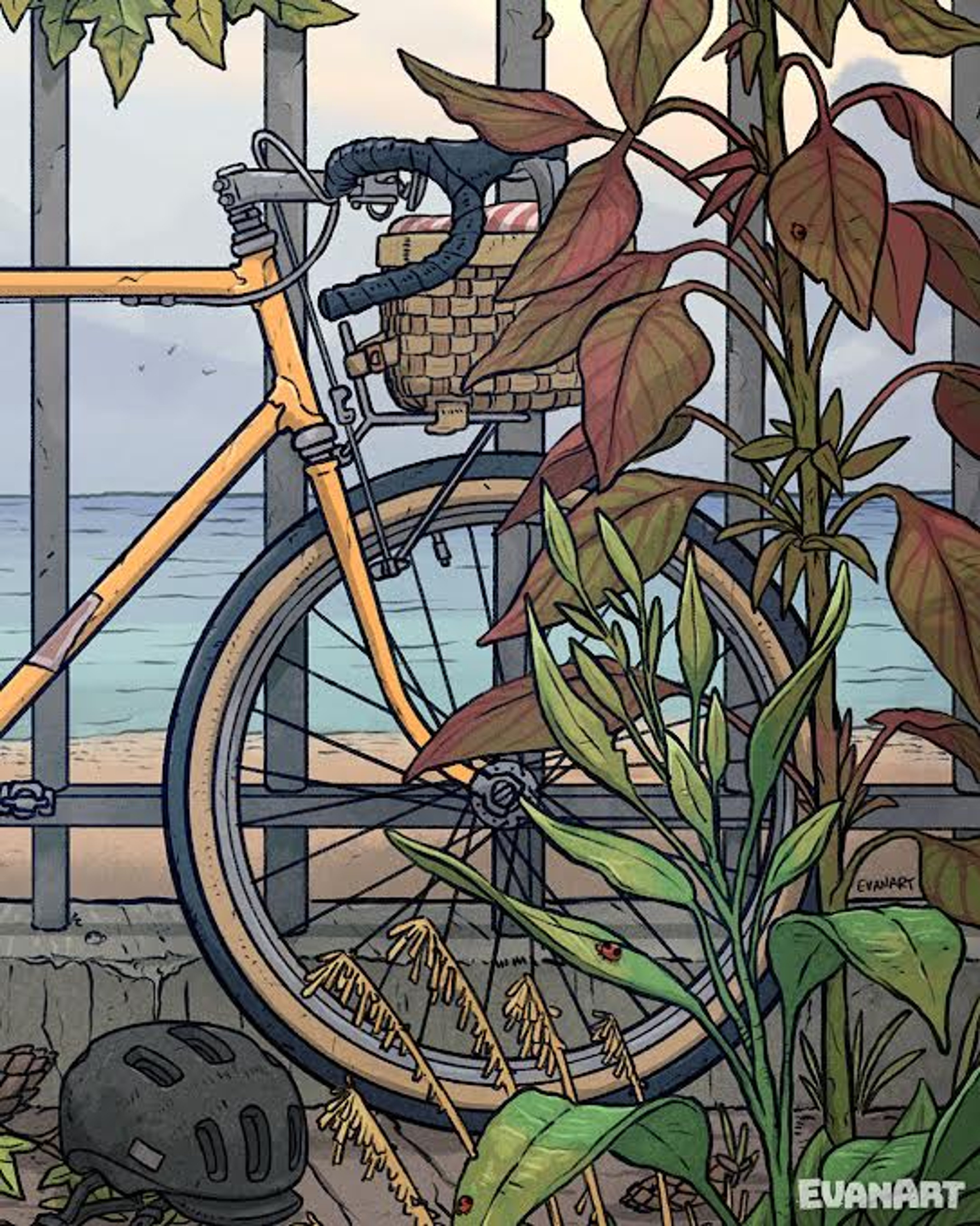 Evan Miller's newest print "Rogers Park" perfectly captures the Northside lakefront. A cyclists dream, easy bike parking! This 9x12 print is matted to fit a 12x16 frame.
