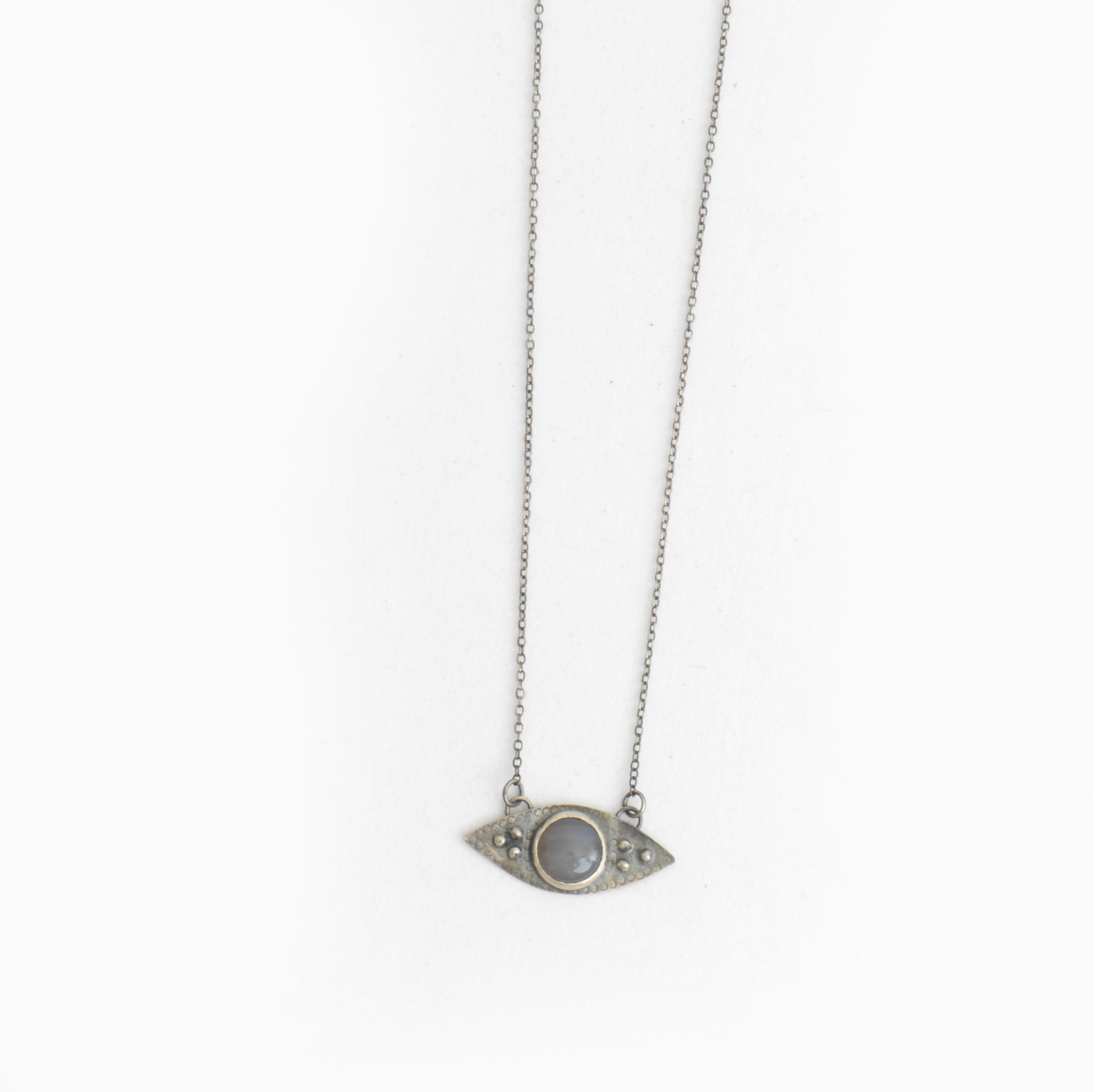 Open your third eye with the gray agate stone, stamped texture and ball details in sterling silver. 16" chain.