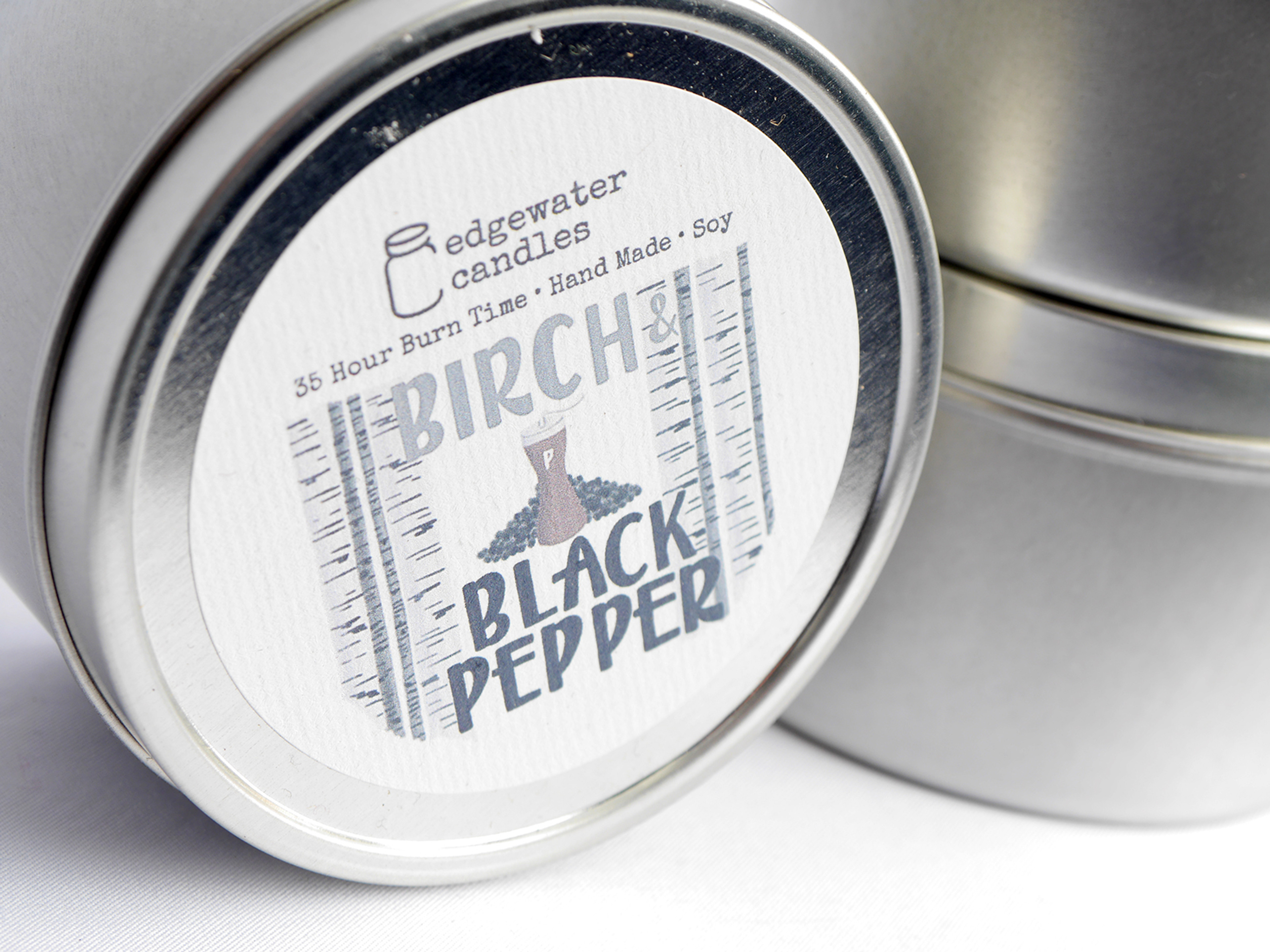 Get gently lured in by the clean, sharp aroma of baked birch. Then surprise your nose with a bright bite of warmth from the King of Spices, black pepper. 6oz Travel Tins are perfect for smaller spaces or to add to your overnight bag. All Edgewater Candles candles are hand poured in small batches using all-natural soy wax. Travel Tins burn for approximately 35 hours.